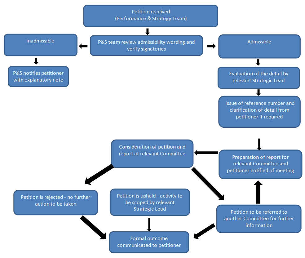 Petitions allow citizens to raise issues directly with Council, either as an individual or on behalf of an organisation. To ensure that the issues raised are dealt with in a consistent way specific criteria have set to describe the process including a process map for submitting petitions and how these will be reviewed.
