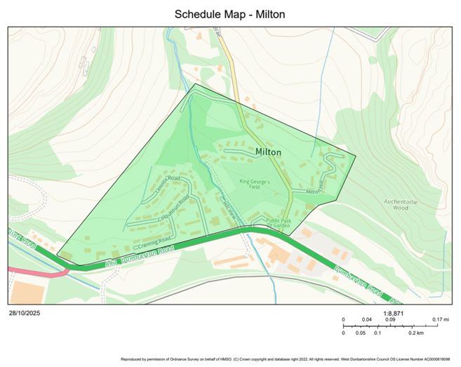 | Milton Brae | From a point 25 metres or thereby north of its western extended kerb line with (A82) Dumbarton Rd in a northern direction, for a distance of 380 metres or thereby. |