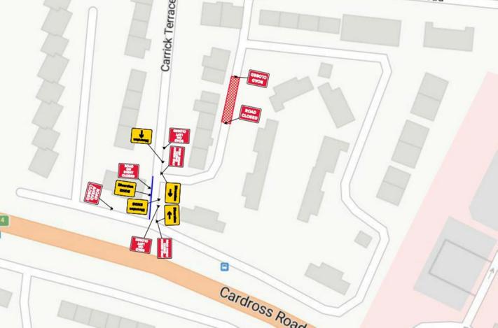 Restriction: Road Closure on Cardross Road, 38 metres from it’s junction with Carrick Terrace, for a distance of 32 metres or thereby.