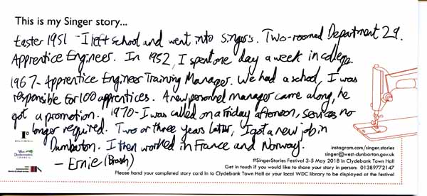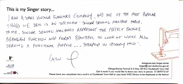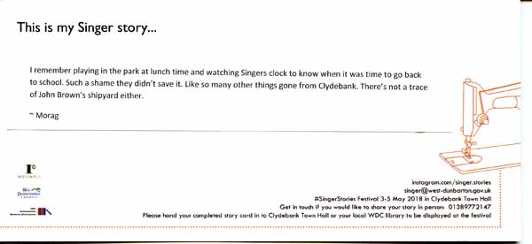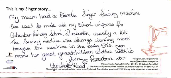 In 2017, we started collecting ‘Singer Stories’ to capture memories of factory life and why Singer is important to people. Volunteers interviewed ex-employees of the factory and we distributed story cards around West Dunbartonshire and further afield for people to write their Singer Stories on. These films and cards were all displayed at the Singer Stories Festival in May 2018 and can be viewed in the slideshow below.